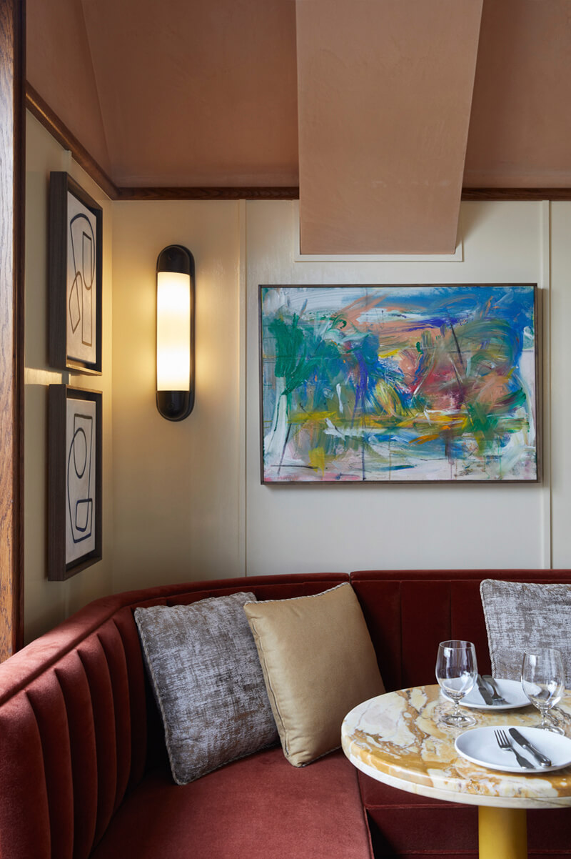 Honest and simple architectural treatments are contrasted by the rich material and fabric choices for the furniture selections. A corner banquette upholstered in a deep red mohair, is complimented by low stools in a black and white patterned fabric and Giallo Siena marble tables. Lighting is provided by high-level aged brass bulkhead fittings, bronze and opal glass wall lights and brass bar lights.