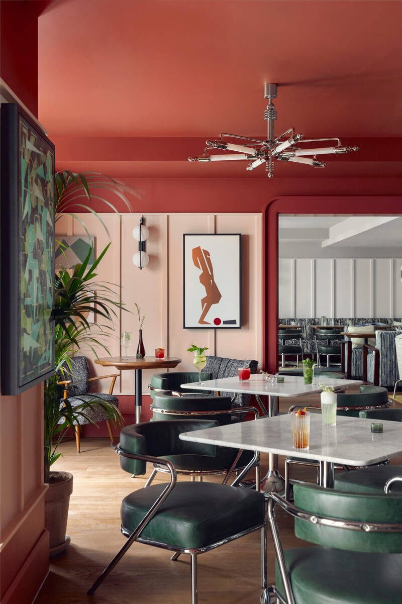 A colourful yet relaxing palette has been used to ensure that these spaces maintain a sense of fun, including muted reds, greens, yellows and blues, echoing the era of the early modernist movement. We have used light timbers, chrome and steel, contrasting with the more tactile finishes used on the furniture. Raw plaster and bold painted finishes have been employed to keep the scheme bright and welcoming.