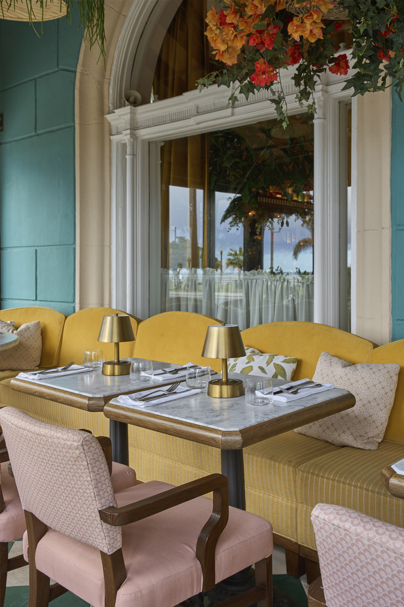 Upon arrival at The Georgian guests enter through the lower and upper restaurant terraces. The original concrete geometric floor pattern has been re-stained off white and racing green and new golden yellow arched backed banquettes line the space allowing for views of the sun setting over Point Dume and the Pacific Ocean.
